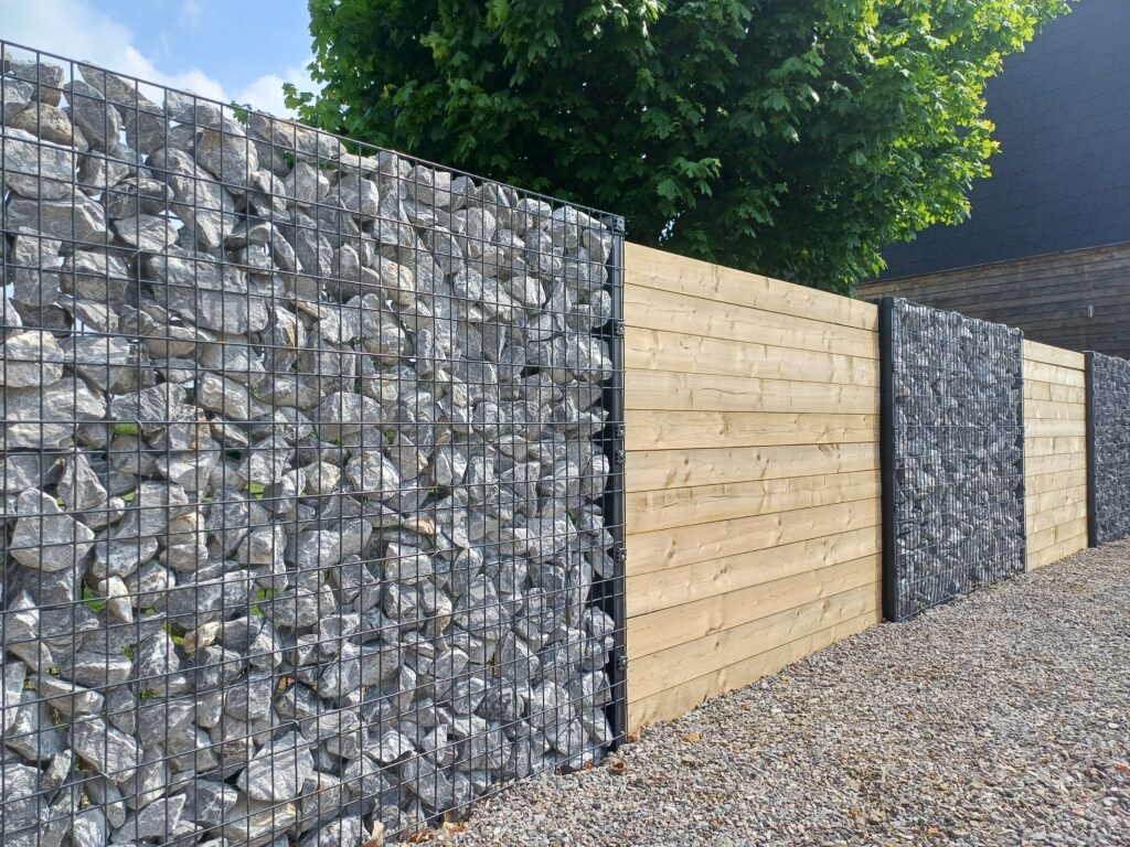 Il est tout à fait possible d’associer ces panneaux avec une palissade à élément en bois ou des murs gabions sans soucis.